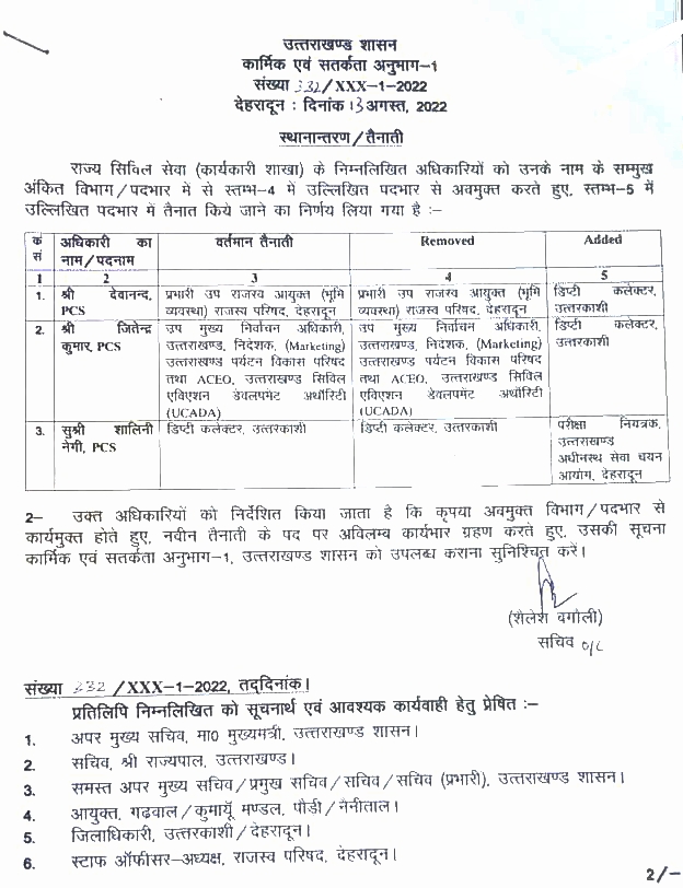 जबकि डिप्टी कलेक्टर उत्तरकाशी के पद पर तैनात शालिनी नेगी को परीक्षा नियंत्रक उत्तराखंड अधीनस्थ सेवा चयन आयोग के पद पर तैनाती दे तत्काल जॉइन करने के आदेश दिए गए हैं।