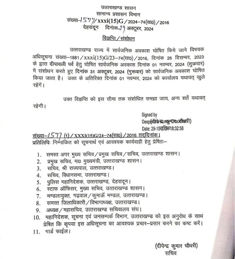 उत्तराखंड में दीपावली को लेकर प्रदेश सरकार ने सार्वजनिक अवकाश की घोषणा कर दी है। जिसके लिए सरकारी आदेश जारी कर दिया गया है।