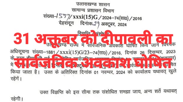 शासन द्वारा जारी किए गए आदेश के मुताबिक 31 अक्टूबर को दीपावली की छुट्टी घोषित की गई है जबकि 1 नवंबर को विधिवत रूप से कार्यालय खुले रहेंगे और सभी शासकीय कार्य होंगे