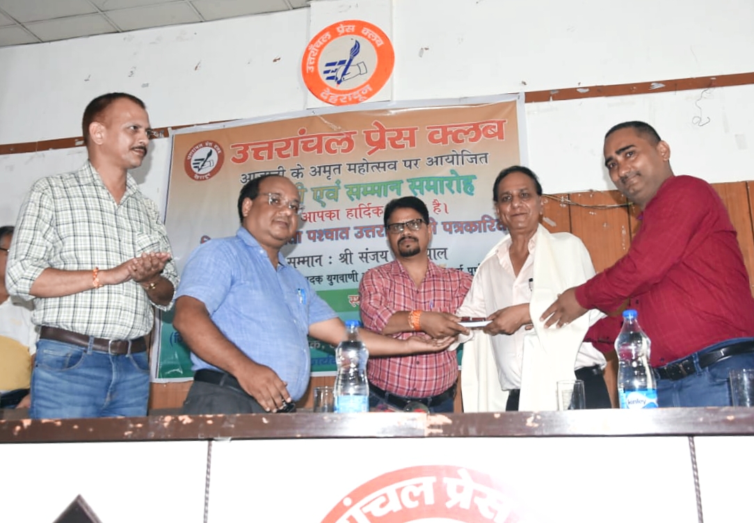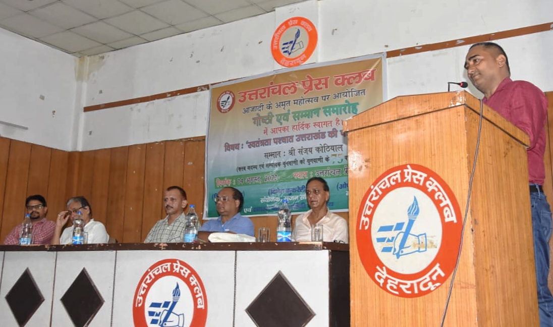 आजादी के अमृत महोत्सव पर उत्तरांचल प्रेस क्लब की ओर से डा.पीतांबर दत्त बड़थ्वाल सभागार में आयोजित गोष्ठी में ‘स्वतंत्रता पश्चात उत्तराखंड की पत्रकारिता’ के सुनहरे दौर को याद किया गया। इस मौके पर 15 अगस्त 1947 को आरम्भ हुई ‘युगवाणी’ के 75 वर्ष पूर्ण होने पर उसके सम्पादक व क्लब के संस्थापक सदस्य वरिष्ठ पत्रकार संजय कोठियाल को सम्मानित किया गया।