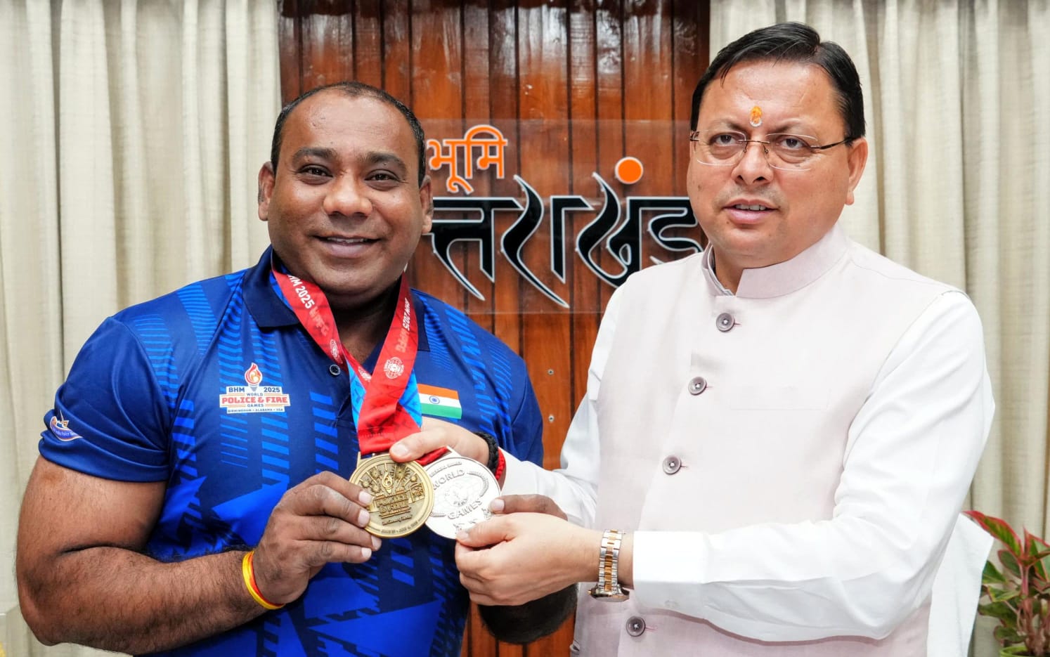 सीएम धामी से वेटलिफ्टर और CID सब इंस्पेक्टर मुकेश पाल ने की भेंट, मुकेश अमेरिका के बर्मिंघम में वर्ल्ड पुलिस एंड फायर गेम्स में पावरलिफ्टिंग में रजत एवं कांस्य पदक जीते है