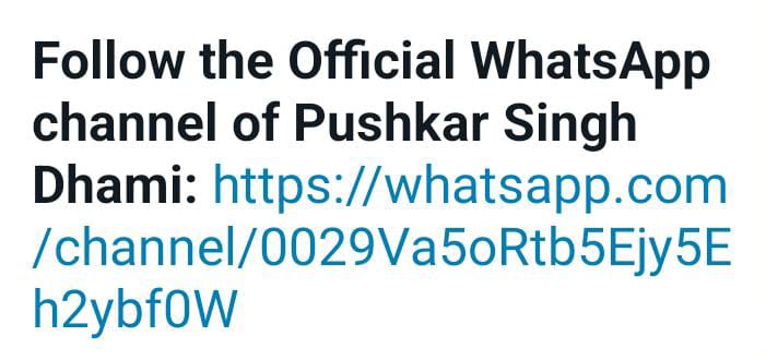 मुख्यमंत्री पुष्कर सिंह धामी के ऑफिसियल व्हाट्सएप चैनल की शुरूआत हो गयी है। इस चैनल के माध्यम से राज्यहित एवं जनहित से जुड़े कार्यक्रमों एवं योजनाओं की जानकारी सर्वसाधारण को उपलब्ध हो सकेगी। उन्होंने कहा कि उनके लिये राज्य हित के साथ जन हित सर्वोपरि है।