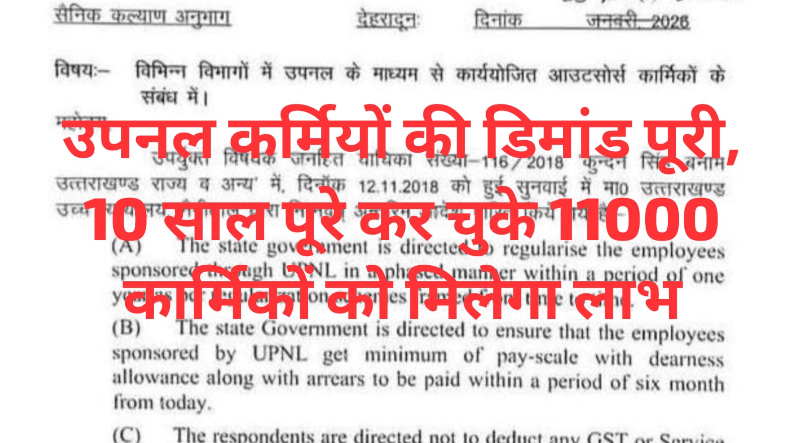 सचिव दीपेंद्र कुमार चौधरी की ओर से जारी आदेश में कहा गया है कि उपनल कार्मिक जो वर्तमान में जिस पद पर कार्यरत हैं, को उस पद के सापेक्ष वेतनमान का न्यूनतम एवं महंगाई भत्ता दिए जाने के लिए उच्च न्यायालय नैनीताल जनहित याचिका में पारित आदेश की तिथि 12 नवंबर 2018 को पात्रता की कट ऑफ डेट मानी जाएगी।