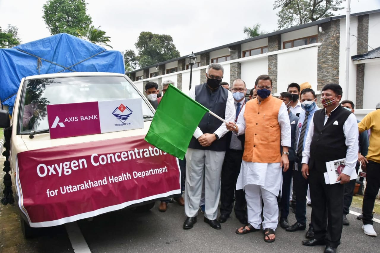 अगले चार माह में उत्तराखण्ड में शत प्रतिशत टीकाकरण का लक्ष्य मुख्यमंत्री ने एक्सिस बैंक द्वारा दिये गये आक्सीजन कन्सन्ट्रेटर्स के वाहन को फ्लैग ऑफ किया मुख्यमंत्री पुष्कर सिंह धामी ने मुख्यमंत्री कैम्प कार्यालय से एक्सिस बैंक द्वारा चिकित्सा स्वास्थ्य विभाग को प्रदान किए गए ऑक्सीजन कंसंट्रेटर के वाहन का फ्लैग ऑफ किया।